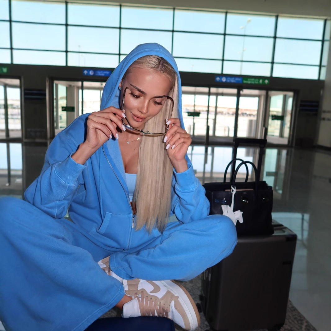 Discover our women's casual hooded suit, perfect for a relaxed day out or your next trip. Combining style and comfort, this suit boasts a high-quality cotton blend that offers a pleasant feel against the skin.