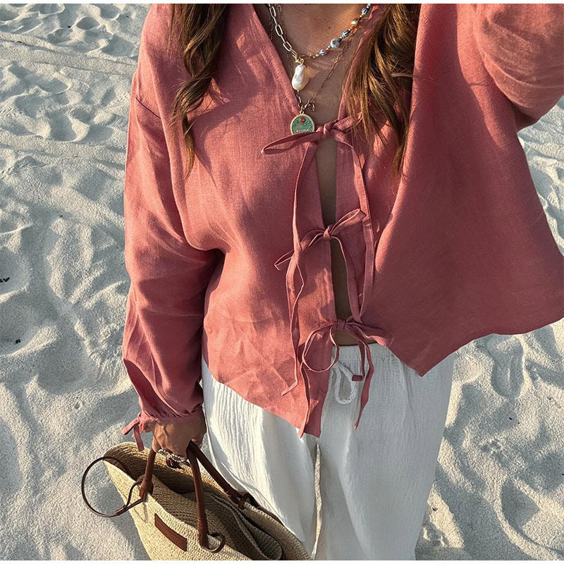 Discover the stylish women's linen blouse with elegant bows from NOVAE, offering a perfect combination of comfort and fashionable design. This high-quality blouse is crafted from premium linen, ensuring a breathable and lightweight feel, ideal for warmer weather.