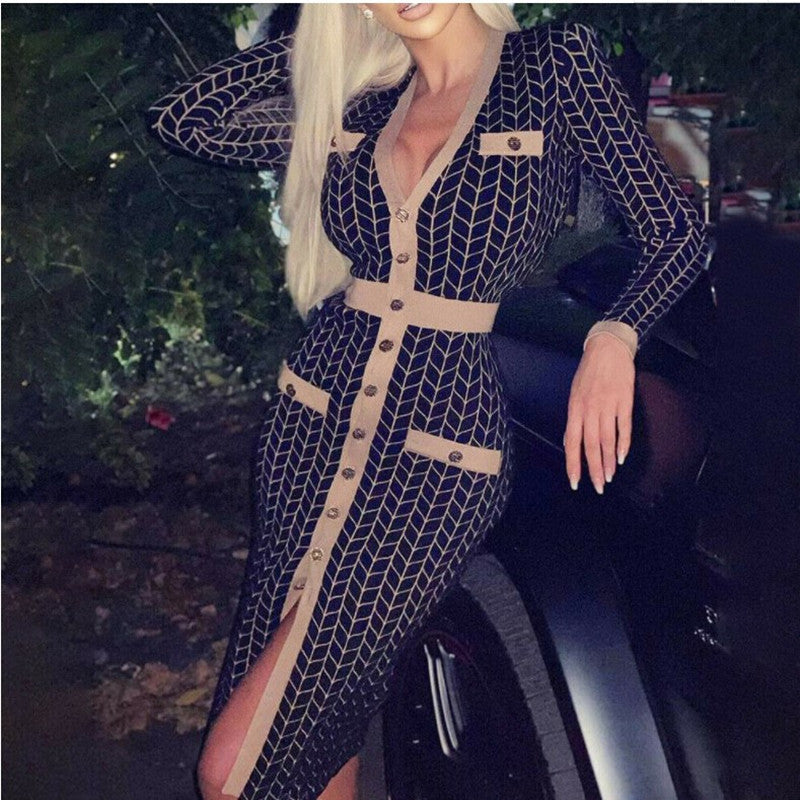 Discover our stylish women's knit dress, which perfectly combines elegance and comfort. The dress features a modern V-neck and full button detailing, creating an appealing look.