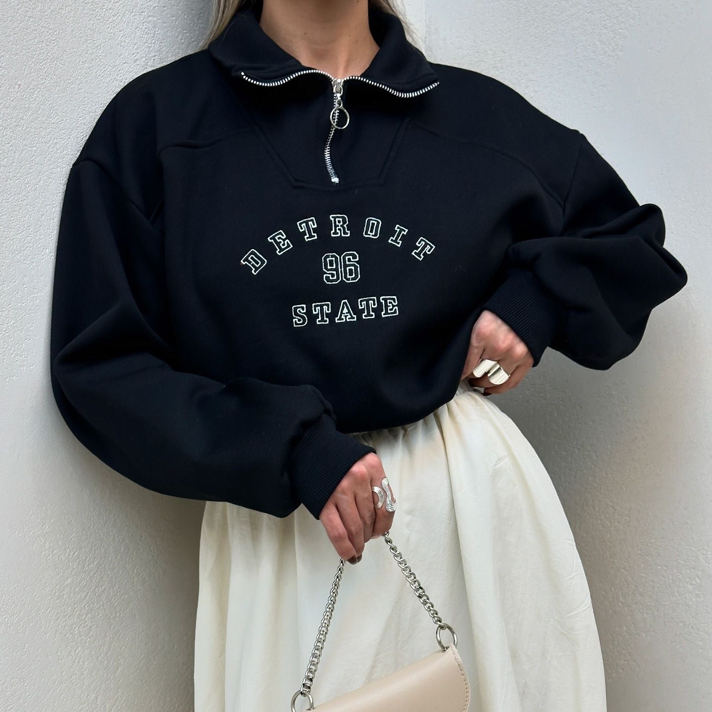 Sina F. October 5, 2025Verified buyerFast shipping!Everything was perfect! The website has a modern design and is easy to use. Delivery was on time, and I am completely satisfied.Women's sweatshirt with stylish stand-up collar and vintage print NOVAE Was that helpful? 0 0