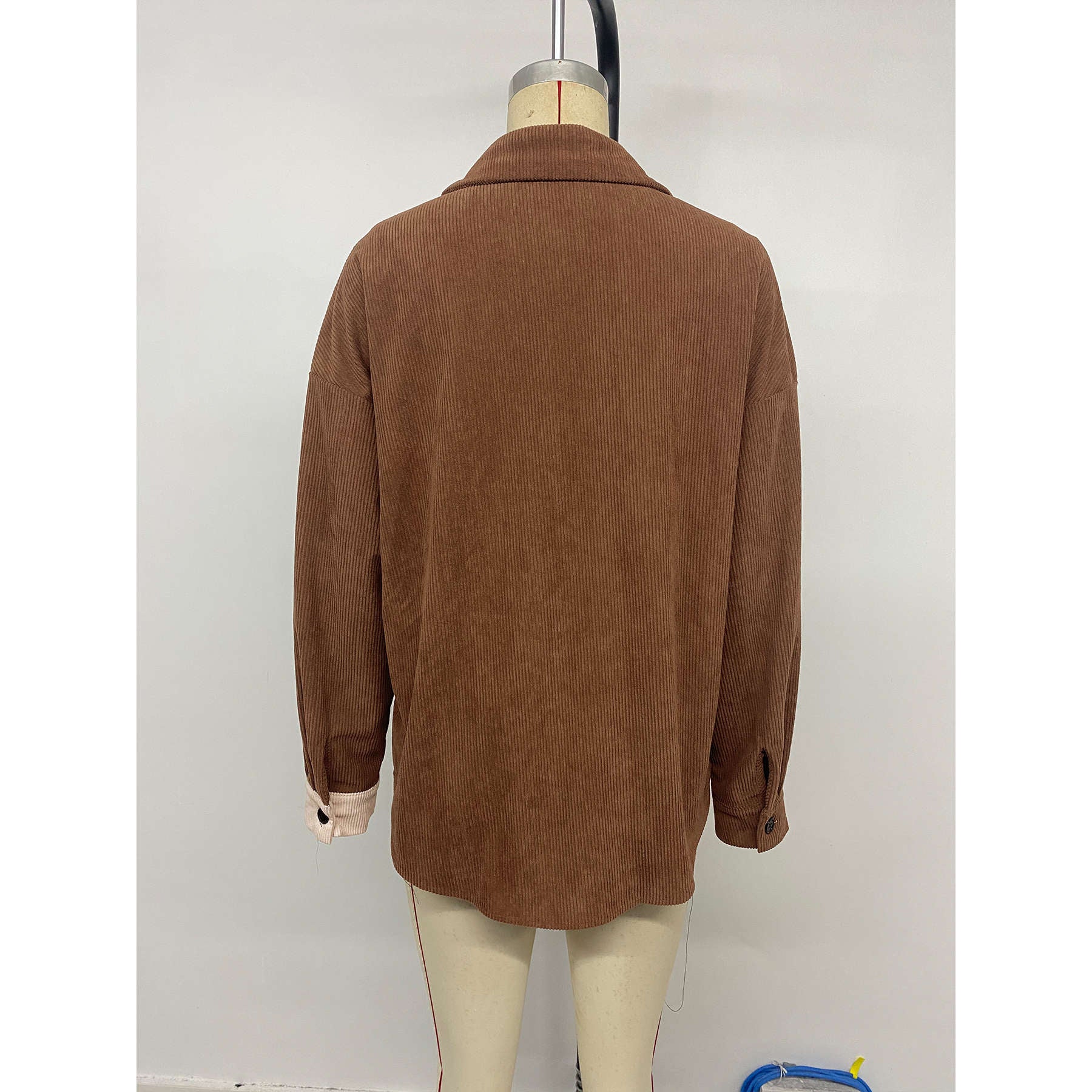 Discover our stylish women's corduroy shirt, featuring a unique color-block design. This shirt combines various shades of brown and adds a modern touch to your outfit.