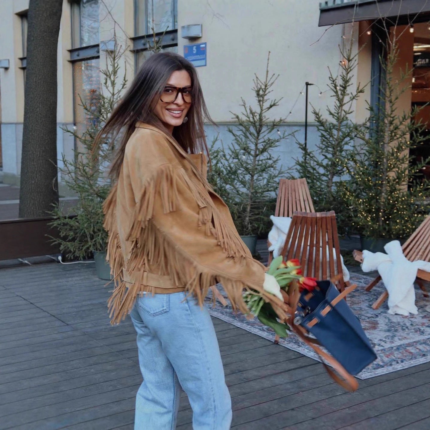 Discover the casual and stylish women's leather jacket with fringe and waist belt from NOVAE, perfect for any season. This jacket combines trendy elements with a comfortable cut and is a must-have in every wardrobe.