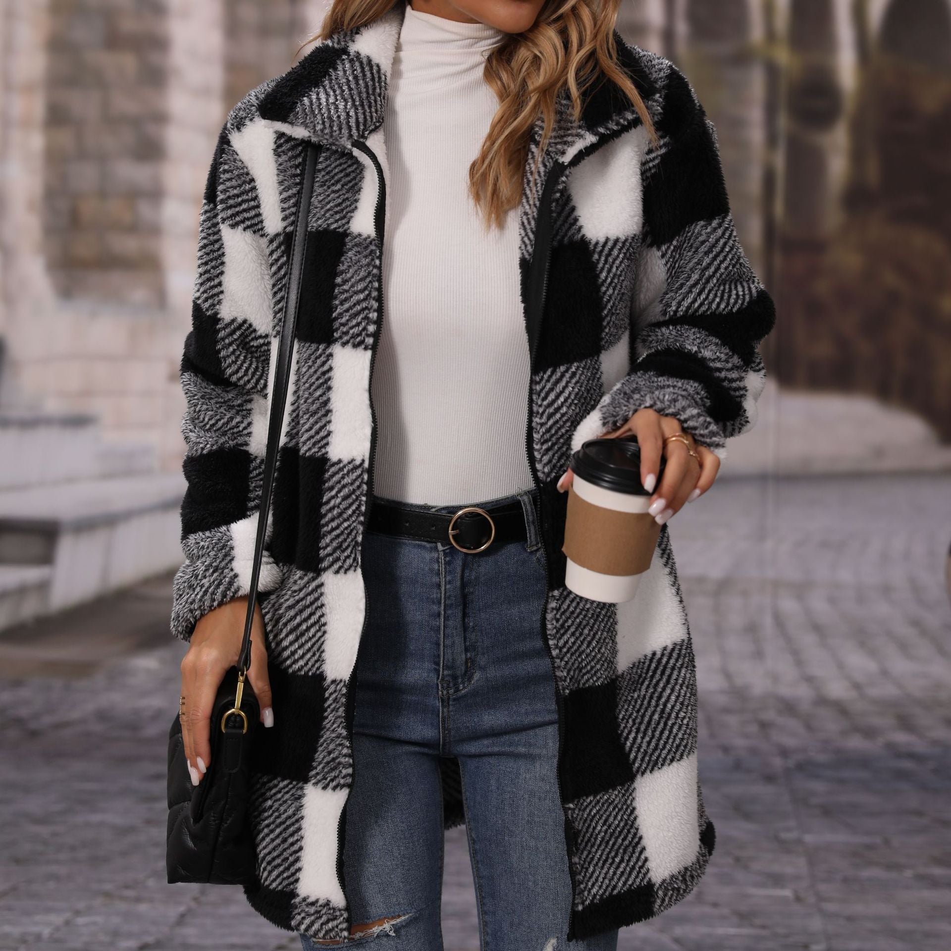 Discover our women's plush jacket in a plaid pattern, ideal for cold days. This stylish jacket combines modern design with maximum comfort.