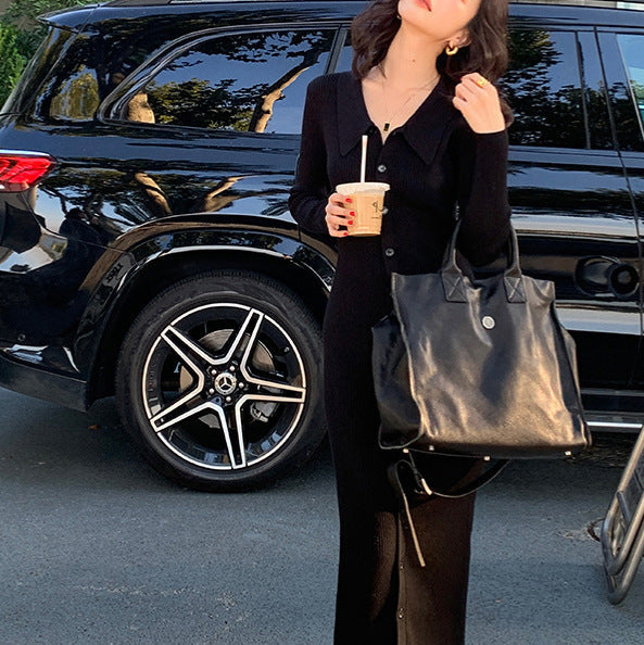 Women's knitted maxi dress with button closure and fashionable collar NOVAE