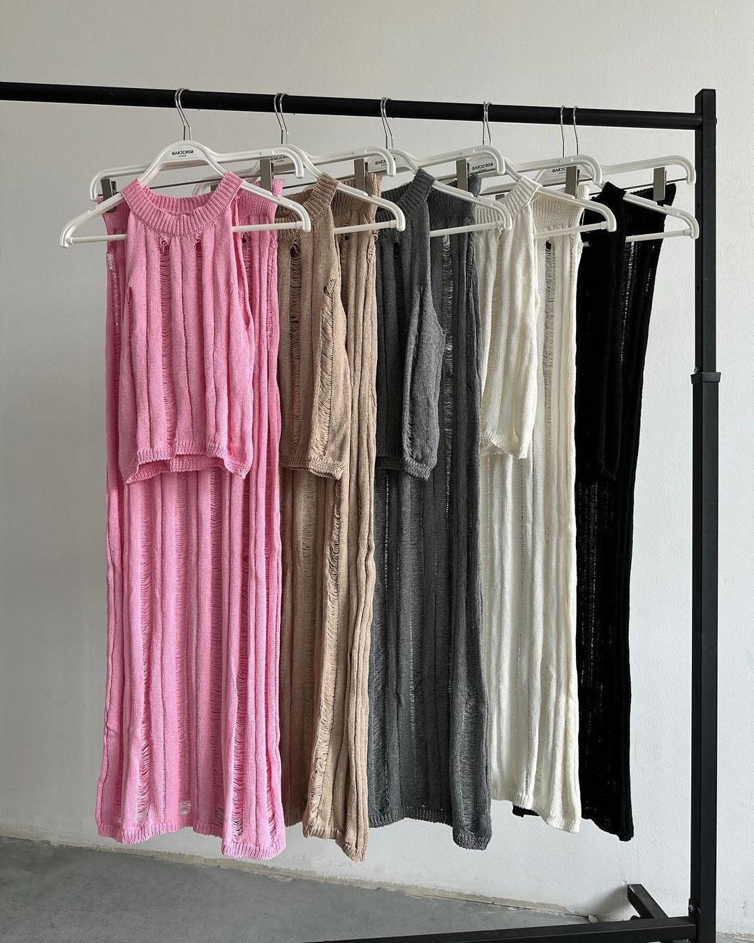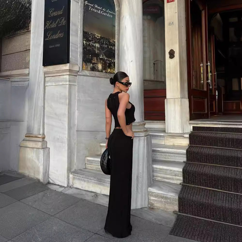 Discover our unique women's two-piece outfit with an elegant knit pattern from NOVAE, ideal for numerous occasions. This ensemble consists of a fashionable top with fine details and an elegant, floor-length skirt that flatters the figure.