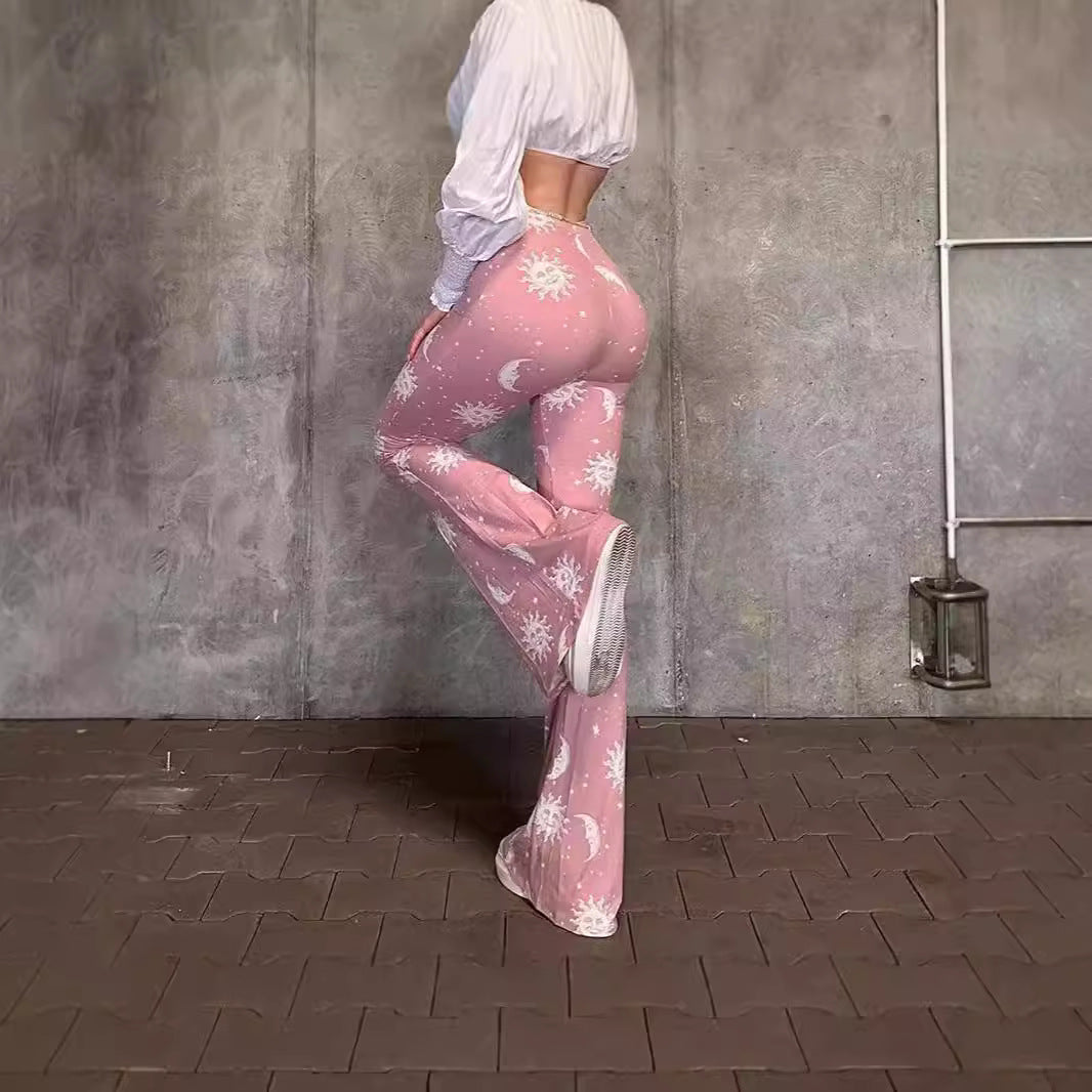 Discover our stylish women's bootcut trousers with a unique artistic moon and sun design. These trousers combine comfort and fashionable flair, ideal for the fashion-conscious woman.