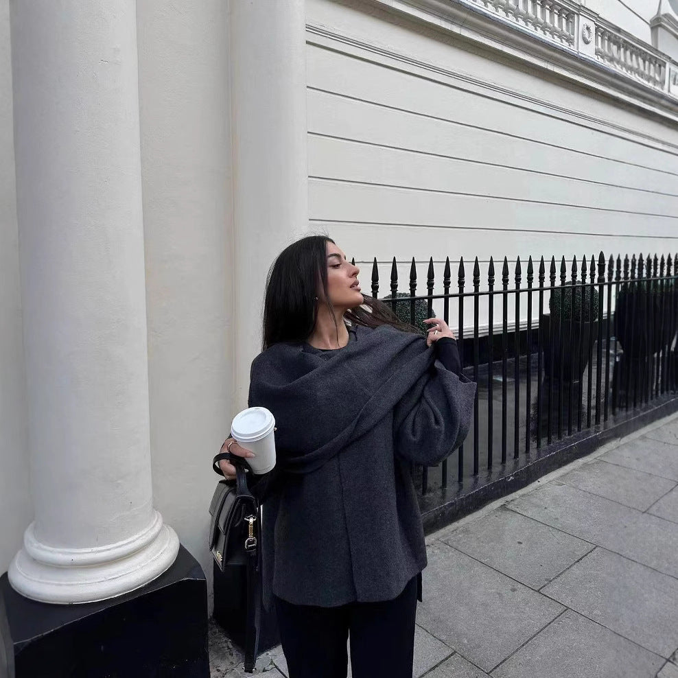 Discover our women's asymmetrical wrap jacket with a large collar from NOVAE, known for its unique style and comfort. This jacket features a modern design and a relaxed fit that elevates any look.