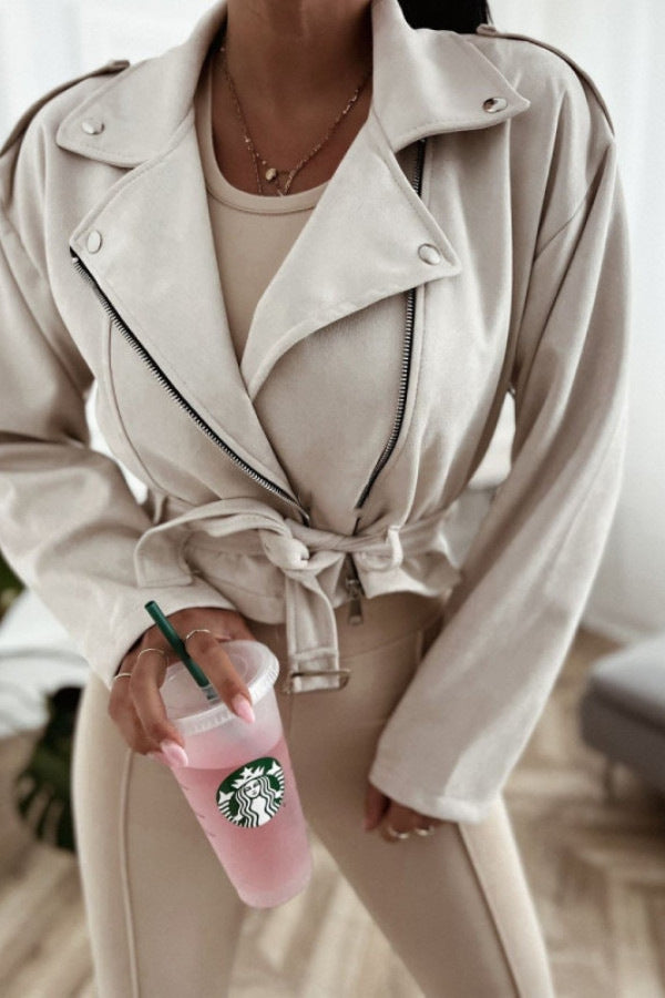 Discover this stylish women's biker jacket made of high-quality faux suede, which will add a special touch to your outfit. This fashionable jacket combines comfort with elegance and is perfect for a variety of occasions.