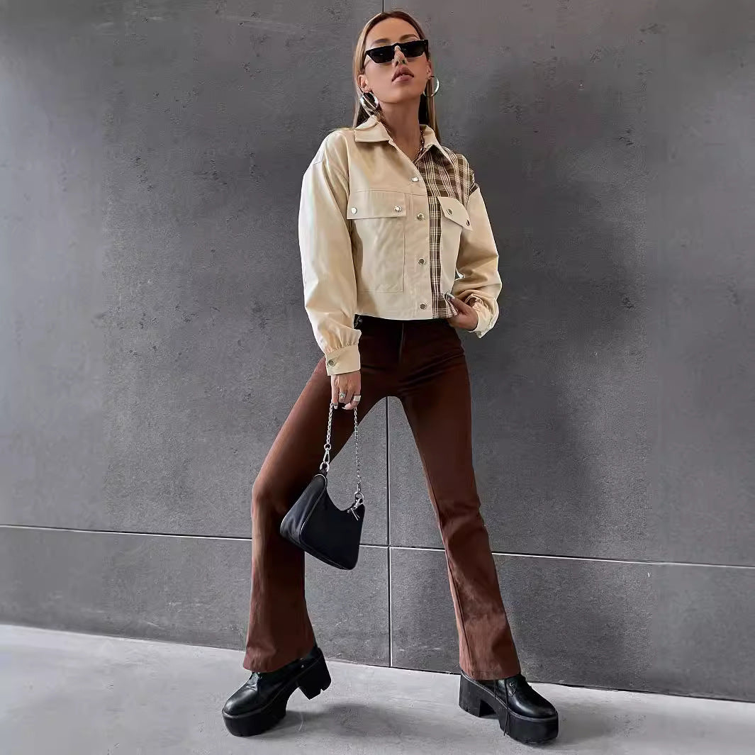 Discover the fashionable women's crop utility jacket , which impresses with its unique design featuring plaid and solid-color details. Ideal for an urban look, it perfectly combines functionality and style.