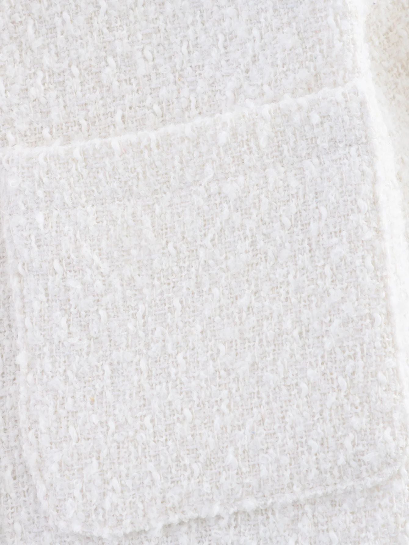 - Elegant design: The jacket features a classic round neckline and a sophisticated button placket with pearl-decorated buttons that add a touch of glamour.