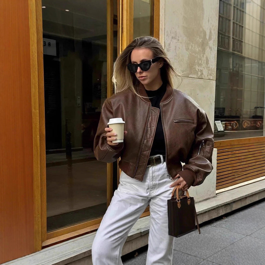 Discover the elegant yet casual women's leather bomber jacket from NOVAE, which combines style and functionality. This fashionable jacket is the ideal companion for any season, offering both warmth and a chic look.