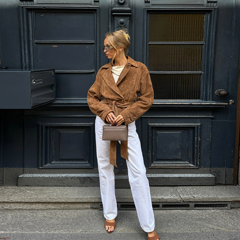 Women's luxury suede jacket with adjustable belt and elegant lapel NOVAE