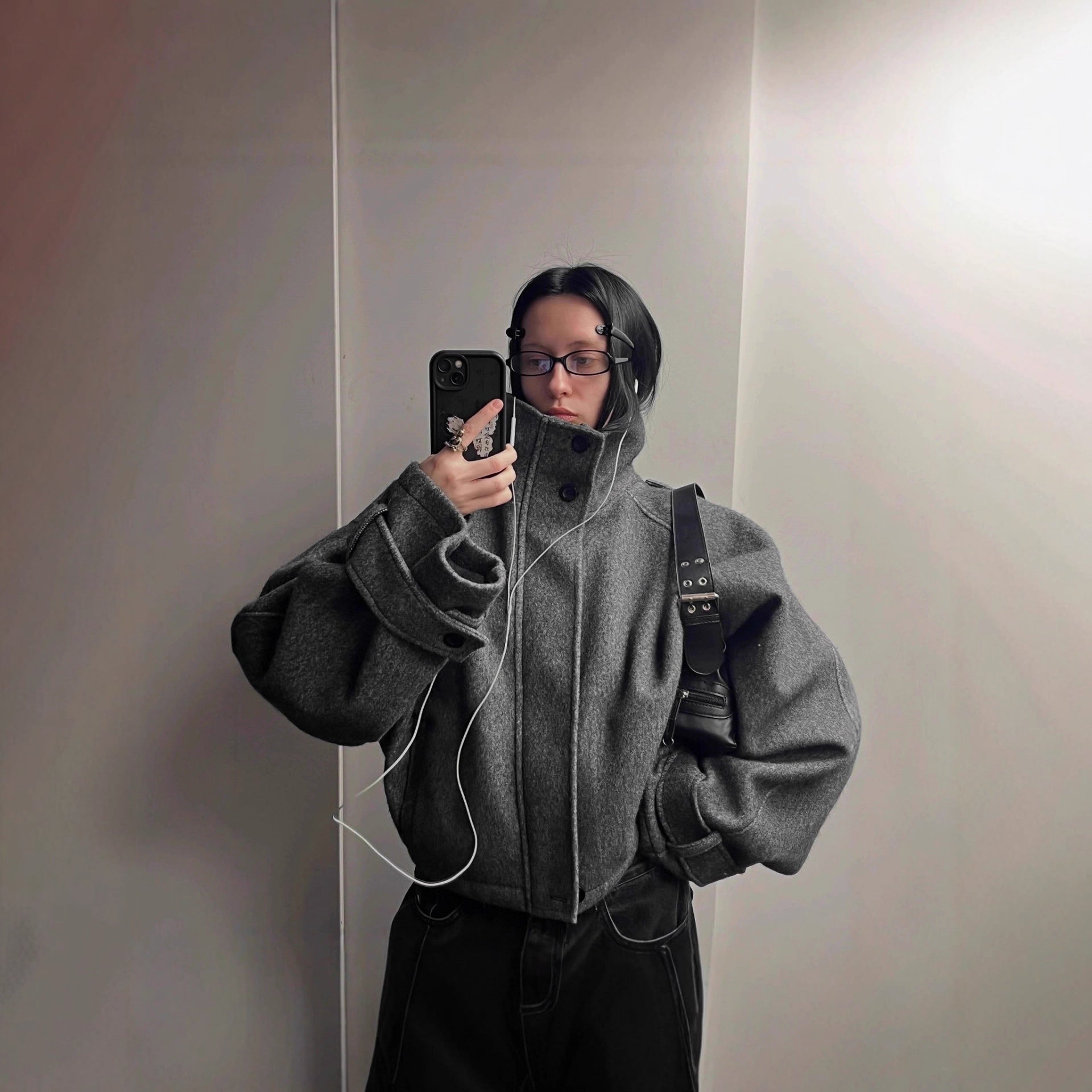 Women's fashionable wool jacket with high collar and button details NOVAE