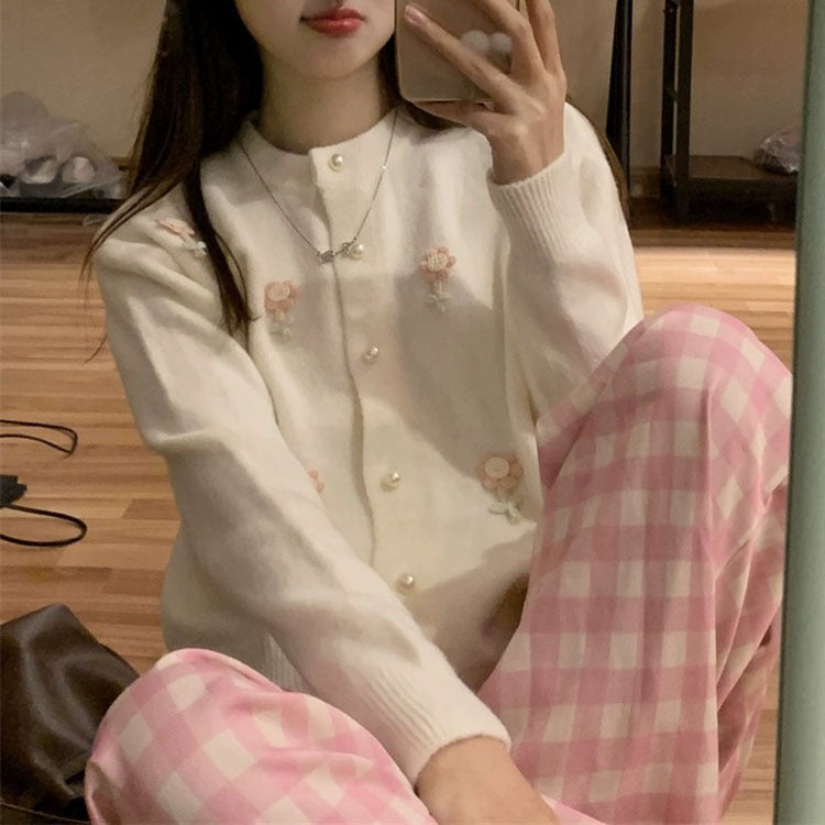 Discover this exquisite women's cardigan, adorned with artistic floral appliqués and elegant pearl buttons. This fashionable jacket combines style and comfort and is perfect for various occasions.