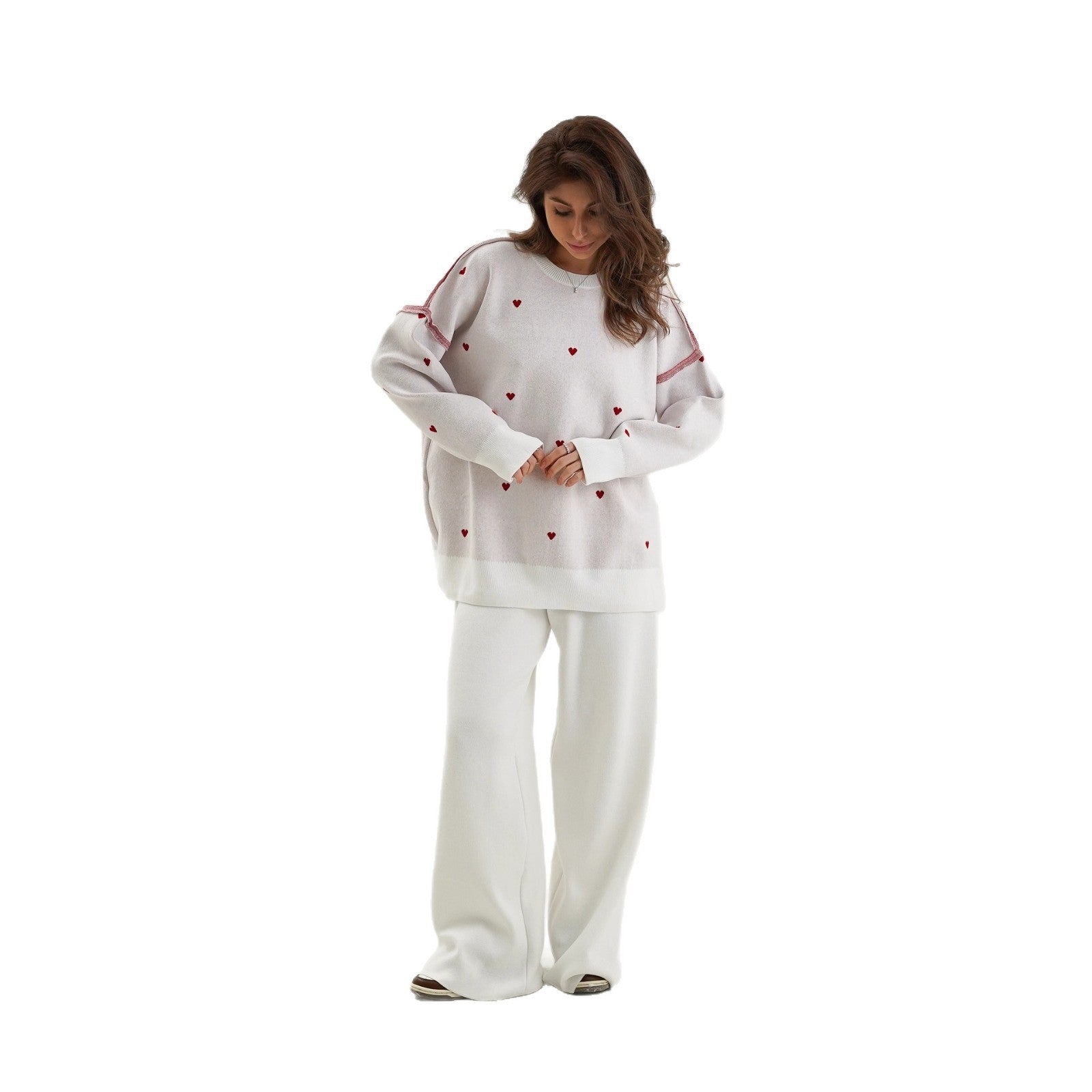 - Design: Playful red hearts that give the sweater a cheerful touch.