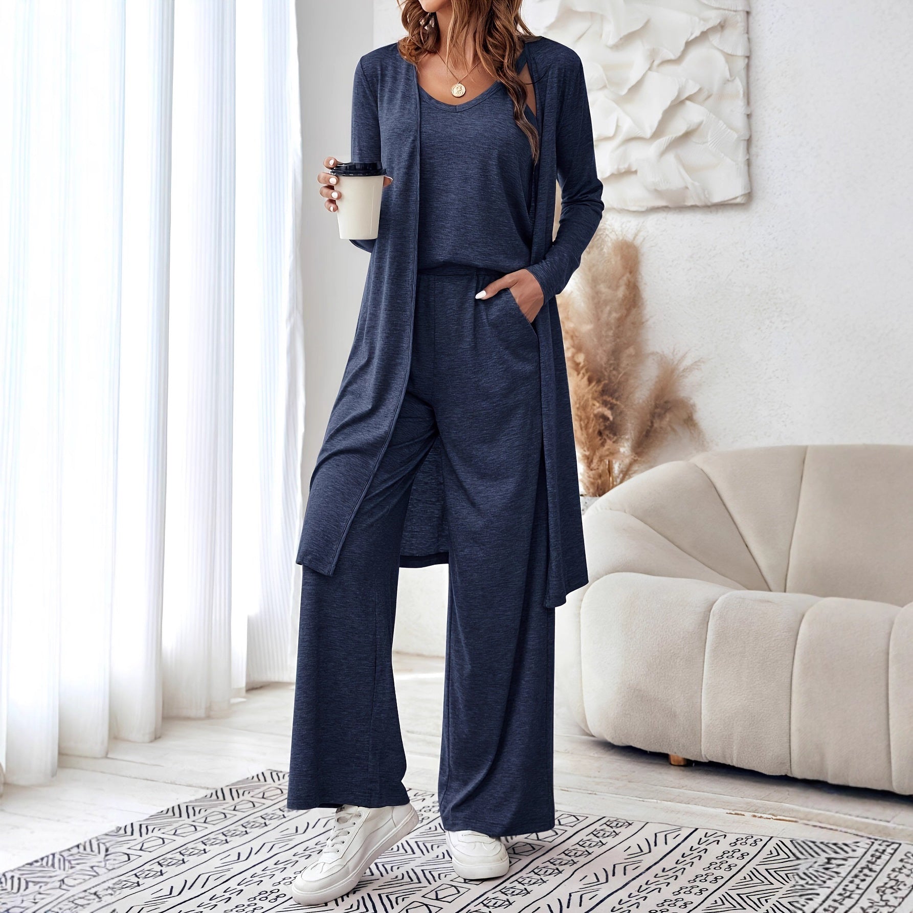 Discover our elegant women's loungewear set, which perfectly combines style and comfort. This set consists of a fashionable long cardigan with a relaxed fit and wide-leg trousers, giving you the ultimate feel-good look.